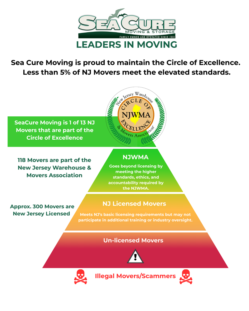As of 2026, there are approximately three hundred (300) licensed movers in the state of New Jersey. Of those, approximately one hundred eighteen (118) are endorsed by the New Jersey Warehouse and Movers Association. Of those, only thirteen (13) qualify as meeting the criteria to earn the Circle of Excellence certification. Sea Cure moving is proud to be among the small circle of thirteen NJ movers that currently maintain the elevated standards required for Circle of Excellence certification.