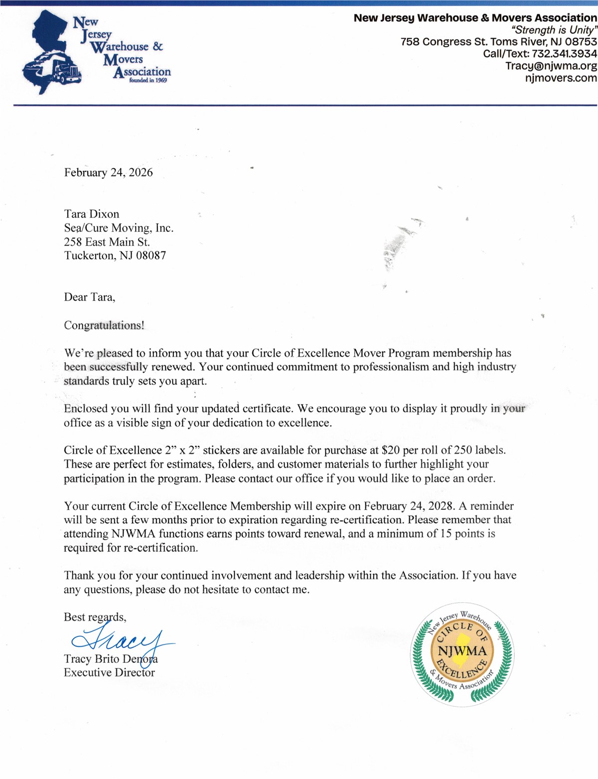 Sea Cure Moving is proud to be recognized as a Circle of Excellence Mover by the New Jersey Warehouse & Movers Association (NJWMA).